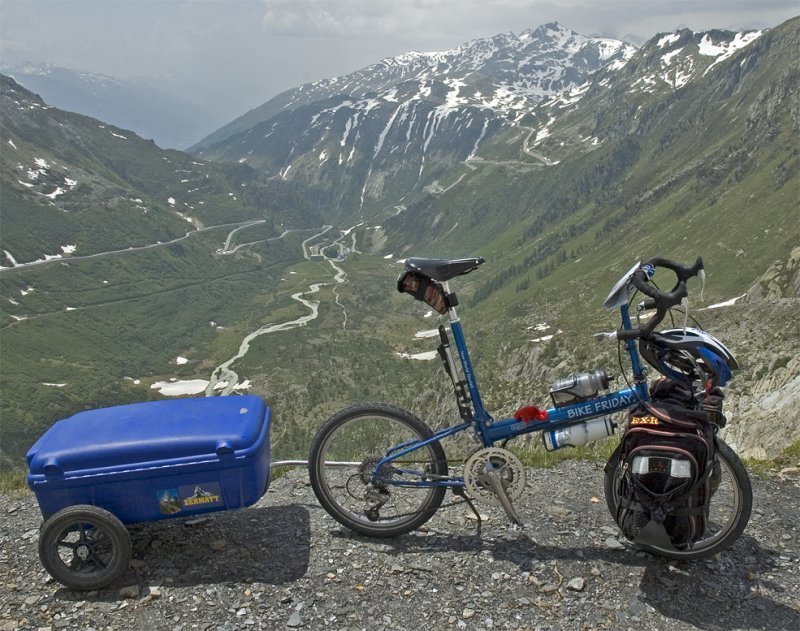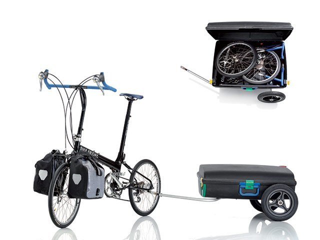 จักรยานยี่ห้อ Bike Friday รุ่น New World Tourist สามารถพับเก็บใส่ในกระเป๋าเดินทางได้, และกระเป๋าเดินทางที่ออกแบบมาเป็นพิเศษ สามารถแปลงเป็นรถลากได้อีกด้วย